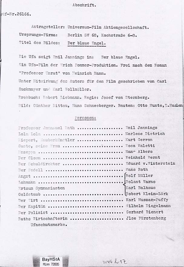 Popis: The film DER BLAUE ENGEL was permitted by the censorship office in Berlin (Film-Prüfstelle Berlin) with age restriction (only for adults 18 years of age or older).