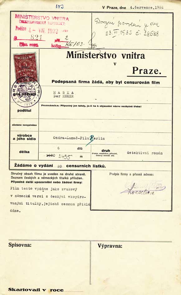 Popis: Film distributing company applies for censoring of the film "Maska".
