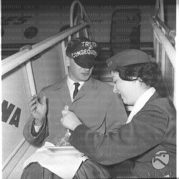 Un uomo - tale sig.Guth - ripreso mentre mangia bendato (a seguito di una scommessa) imboccato da una hostess - piano medio