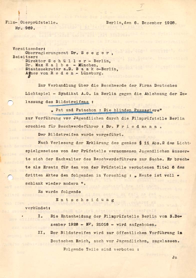 Description: The production company "Deutsches Lichtspiel - Syndikat A.G., Berlin" applied against the ban (for young people) of the film "Pat und Patachon: Die blinden Passagiere" at the censorship headquarter in Berlin. The application was accepted. The film was permitted without age restriction. One scene was additionally banned.