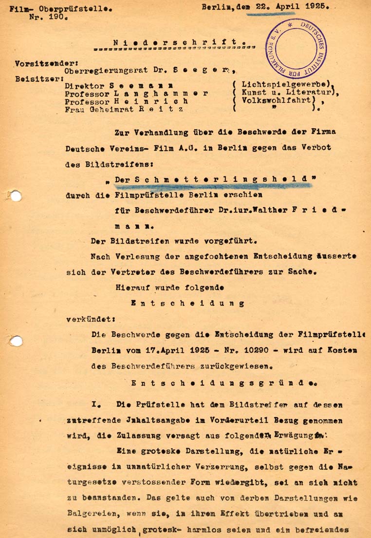 Kuvaus: The production company "Deutsche Vereins-Film A.G., Berlin" applied against the ban of the film "Der Schmetterlingsheld" at the censorship headquarter in Berlin. The application was rejected.