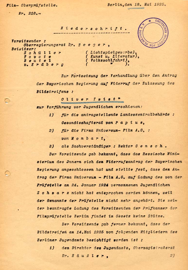 Kuvaus: The provincial government of Bavaria applied for revocation of permission of the film "Oliver Twist" at the censorship headquarter in Berlin. The application was accepted. The film was only permitted for adults 18 years of age or older.