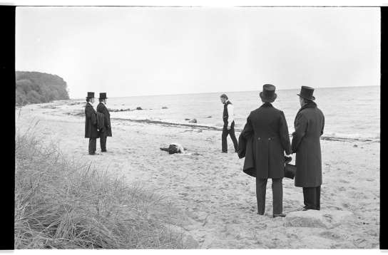 Szene mit Ulli Lommel (3.v.l.), Wolfgang Schenck (4.v.l.), Ernst Küsters (2.v.r.), Karlheinz Böhm (1.v.r.)