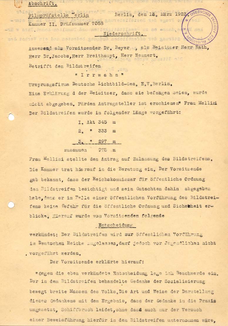 Description: The film "Irrwahn" was permitted by the censorship office in Berlin with age restriction (only for adults 18 years of age or older).