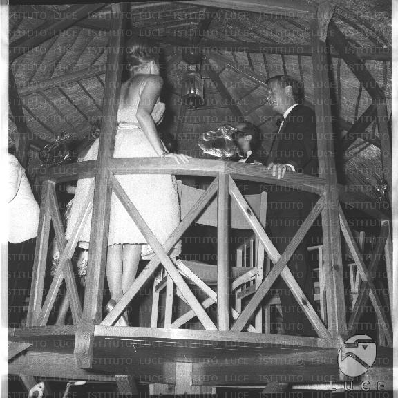 Il sarto Mingolini con delle persone in una struttura in legno. Campo medio