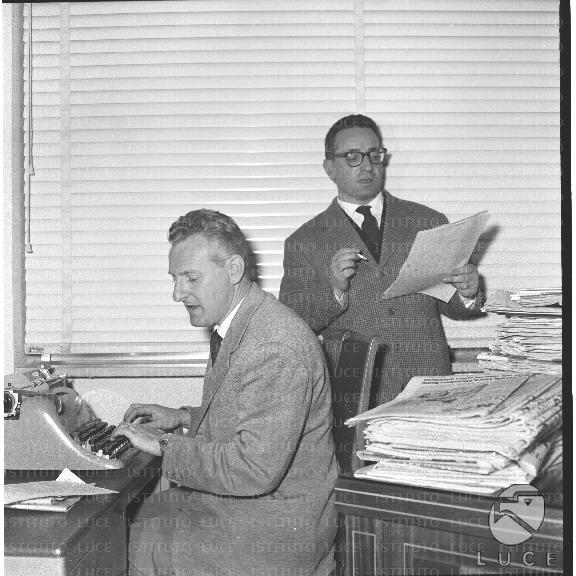 Ugo Zatterin davanti alla macchina da scrivere e Gianni Granzotto in piedi, a dettare, ripresi in un interno - piano americano