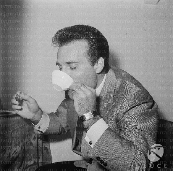 Altri titoli: Giacomo Rondinella ripreso prima di uno spettacolo mentre beve un caffé - piano medio