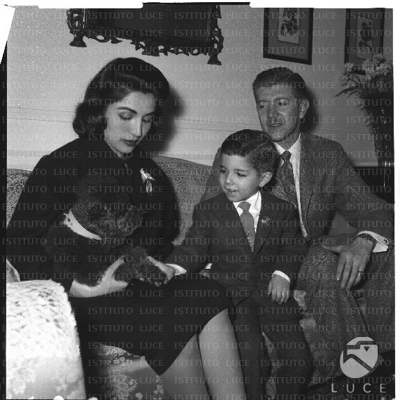 Interni: la sorella dello scià di Persia è ritratta con il marito occidentale e il figlio, seduti su un divano. La principessa ha in braccio un barboncino, al quale il bimbo accarezza una zampa. Totale del gruppo