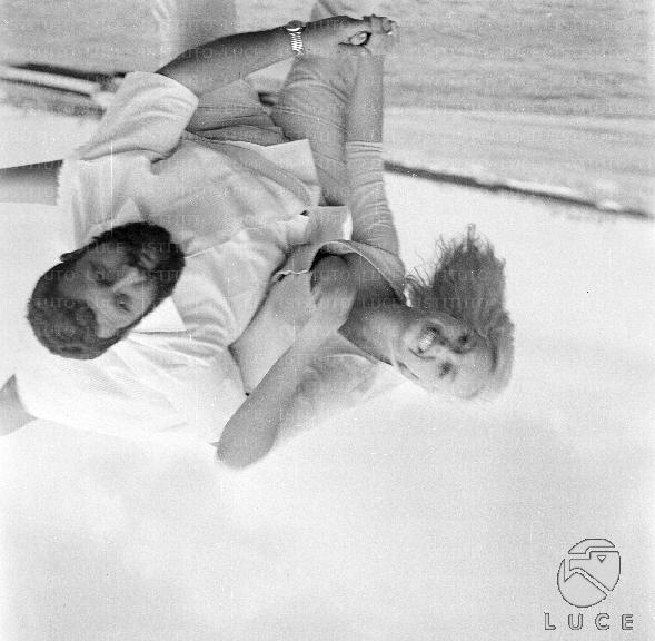 Kitas pavadinimas (ai): Barbara Valentin, scherza con un uomo, al Lido di Venezia in occasione della Mostra del Cinema - piano americano