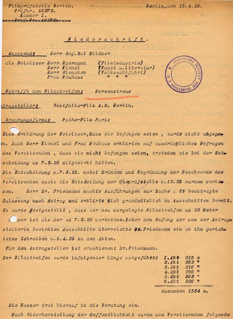 Aprašymas: The film "Herzenstreue" was banned by the censorship office in Berlin.