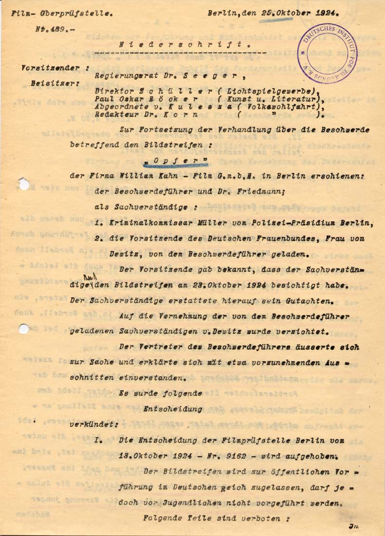 Aprašymas: The production company "William Kahn-Film G.m.b.H." applied against the ban of the film "Opfer" at the censorship headquarter in Berlin. The application was accepted. The film was permitted for adults 18 years of age or older. One scene was banned.