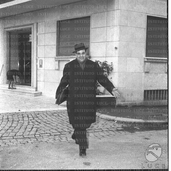 Alternativ tittel: Arnaldo Maria Angelini, nuovo direttore dell'ENEL, ripreso mentre esce di casa - totale
