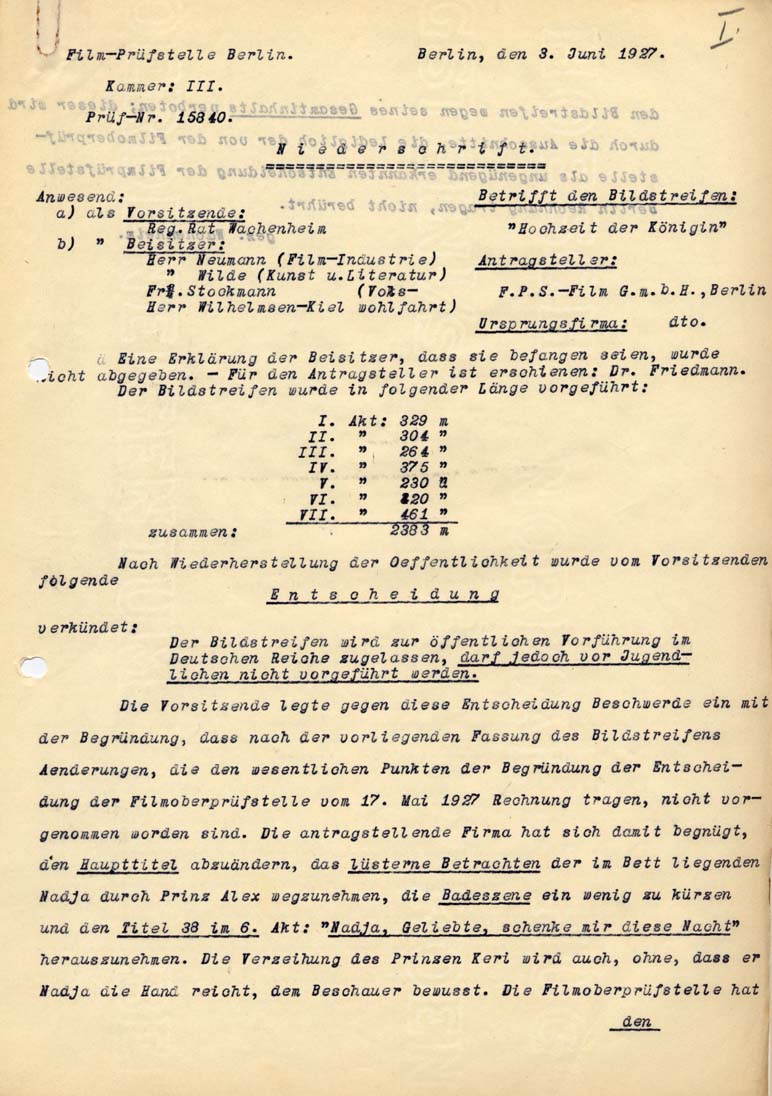 Beskrivelse: The film "Hochzeit der Königin" was permitted by the censorship office in Berlin with age restriction (only for adults 18 years of age or older).
