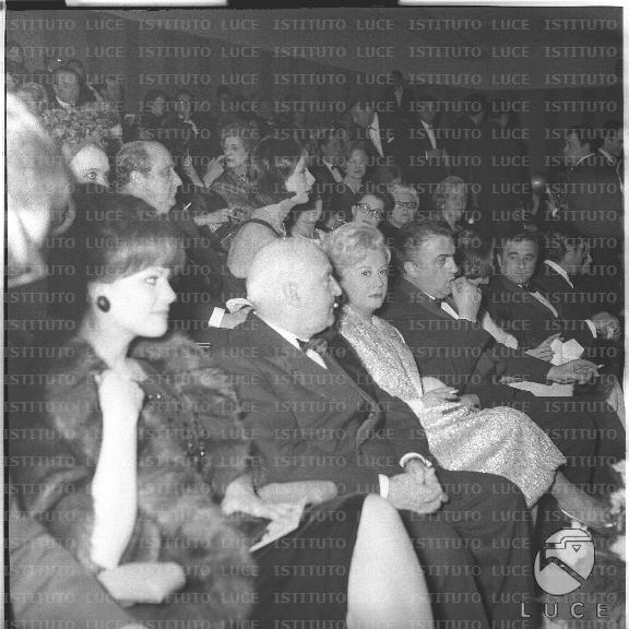 Claudia Cardinale, Angelo Rizzoli, Giulietta Masina, Federico Fellini e Rossella Falk (nella fila dietro) seduti nella platea del cinema Fiamma per la prima del film 'Otto e 1/2' - piano americano
