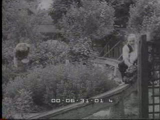 2 - l'uomo esce in giardino con la locomotiva tra le mani e con un tubo la rifornisce di acqua