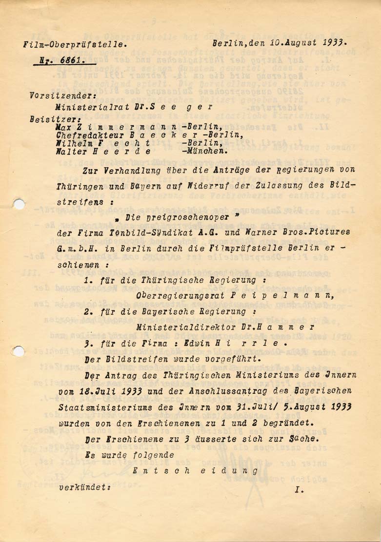 Beschreibung: The provincial governments of Bavaria and Thuringia applied for revocation of permissionof the film "Die 3-Groschen-Oper" at the censorship headquarter in Berlin (Film- Oberprüfstelle). On 10th August 1933 the application was accepted. The film was banned outright.
