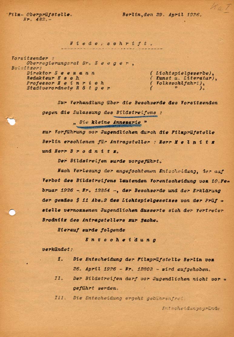 Description: The chairman applied for revocation of permission of the film "Die kleine Annemarie" at the censorship headquarter in Berlin for young people. The application was accepted. The film was prohibited for young people