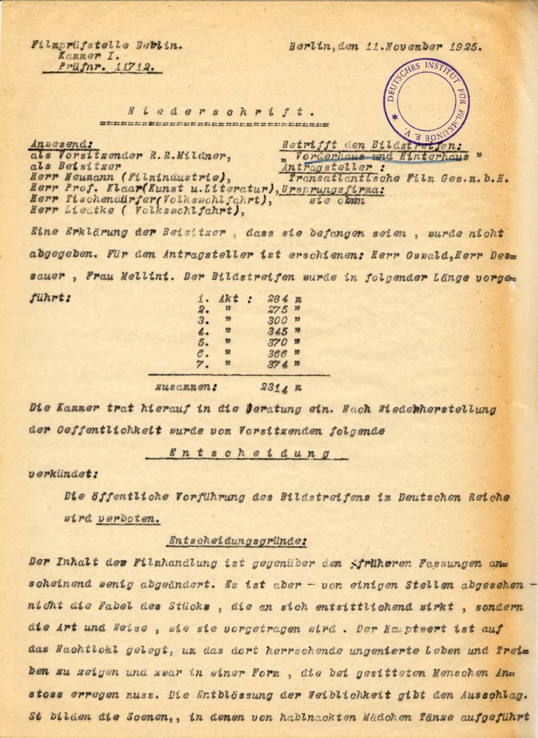 Description: The film "Vorderhaus und Hinterhaus" was banned by the censorship office in Berlin.