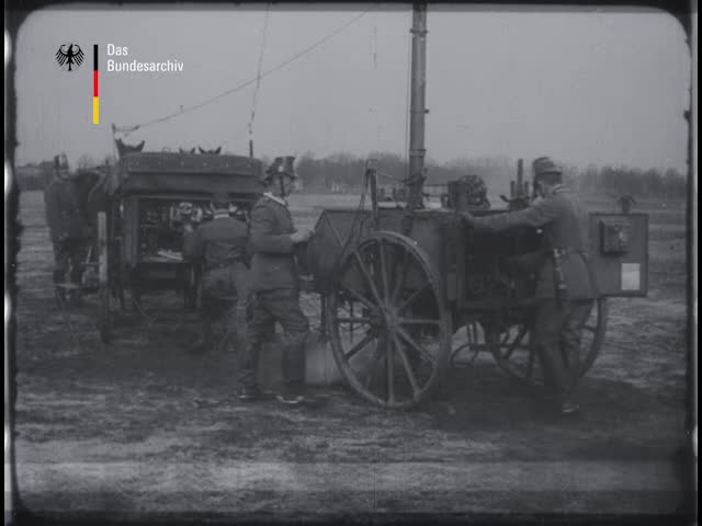 Orders given to the crew of an armoured fighting vehicle, entry and departure; horsedrawn signal corps unit takes up a position; riflemen unload signal equipment, erect a transmission mast and establi...