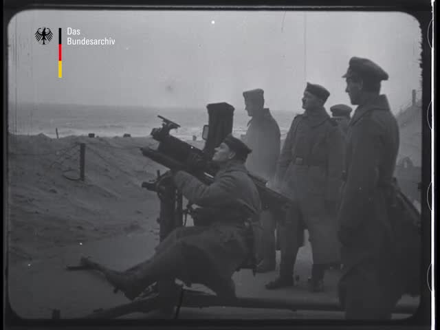 1. Intertitle: I. World war; practice shooting on the North Sea coast near Blankenberge with automatic flak gun (loaded with 6-shot cartridges) without gunner. 2 Intertitle: Automatic flak gun on rota...
