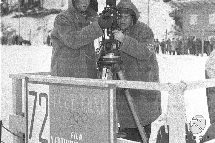 Cortina d'Ampezzo Un cineoperatore ed il suo collaboratore sono intenti alle riprese dalla postazione dell'Istituto Luce per il film "Vertigine bianca"