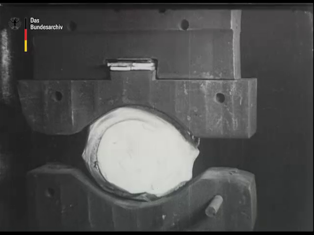 2. Teil: Anfertigung von Minenwerferrohren Bild: Vorwärmen des Stahlblocks im Schmelzofen; Vorschmieden des erwärmten Blocks unter dem Dampfhammer; Abschlagen der Blockenden; Ausschmieden des untere...