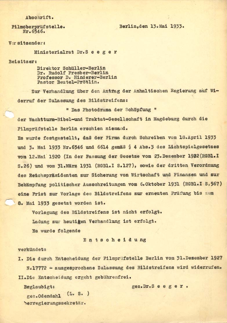 Aprašymas: The provincial government of Anhalt applied for revocation of permission of the film "Das Photodrama der Schöpfung" at the censorship headquarter in Berlin. The application was accepted, the film was banned.