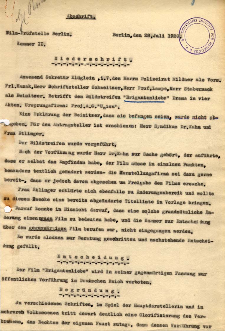 Descrição: The film "Brigantenliebe" was prohibited by the censorship office in Berlin. The production company "Proj. A.G." applied against the ban of the film at the censorship headquarter in Berlin. The application was accepted. The film was permitted with age restriction (only for adults 18 years of age or older).