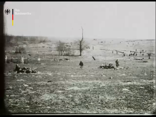 1. Zwischentitel: Der Fesselballonbeobahter hat gemeldet, daß feindliche Truppenansammlungen in den Gräben stattfinden. Bild: Gruppe Soldaten an Feldfernsprecher und bei Aufnahme der Meldung. 2. Zwi...